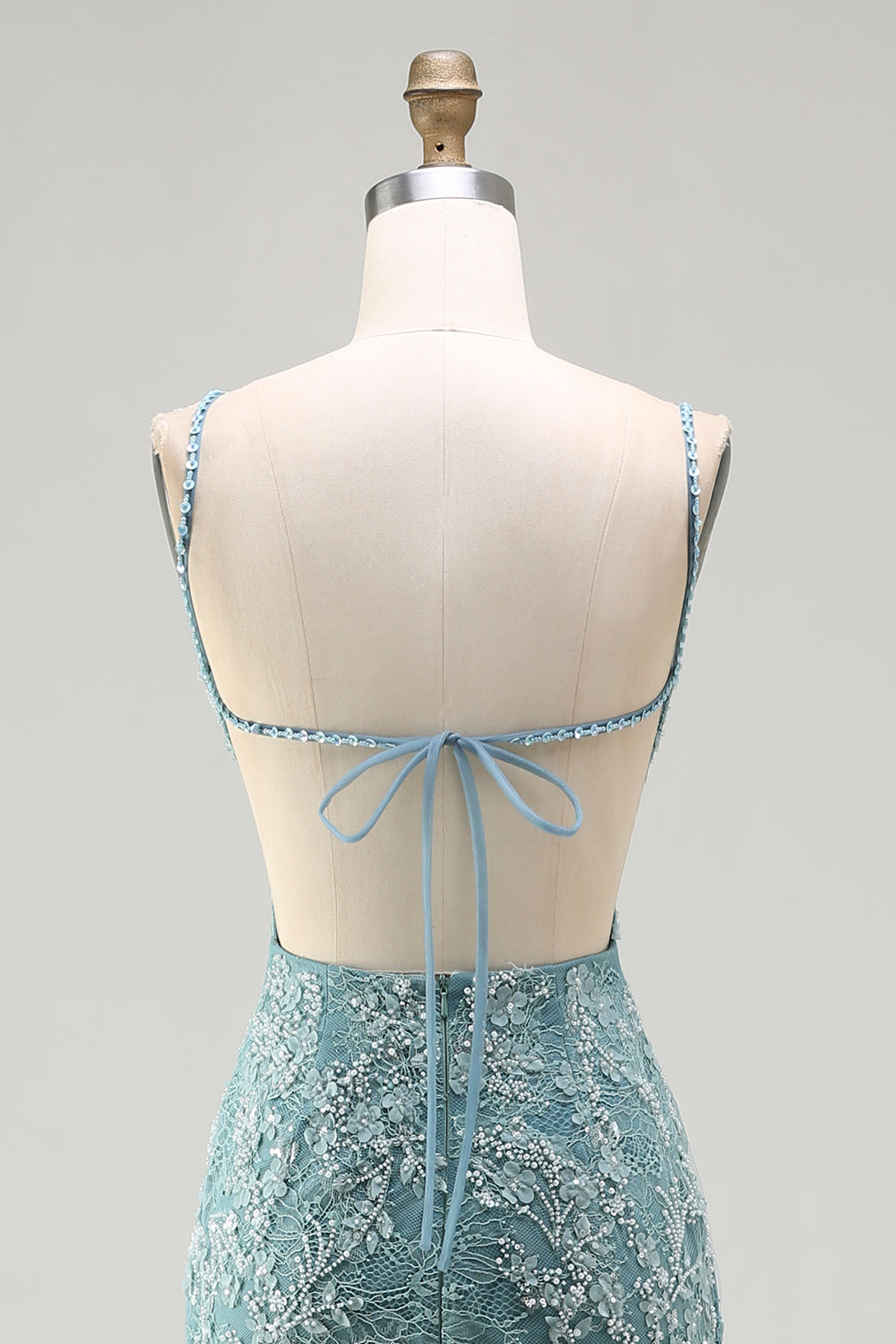 Grey Green Mermaid Beaded Backless Applique Long Prom Dress with Slit