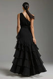 Black A Line Tiered One Shoulder Maxi Formal Dress with Slit