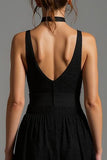 V-Neck Black A-Line Backless Long Formal Dress with Lace