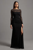Illusion Neck Black Sheath Long Sleeves Formal Dress with Slit
