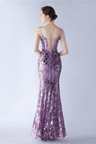 Burgundy Spaghetti Straps V-neck Swquin Sheath Formal Dress with Slit