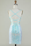 Bling Sheath Spaghetti Straps Light Blue Sequins Short Homecoming Dress with Criss Cross Back