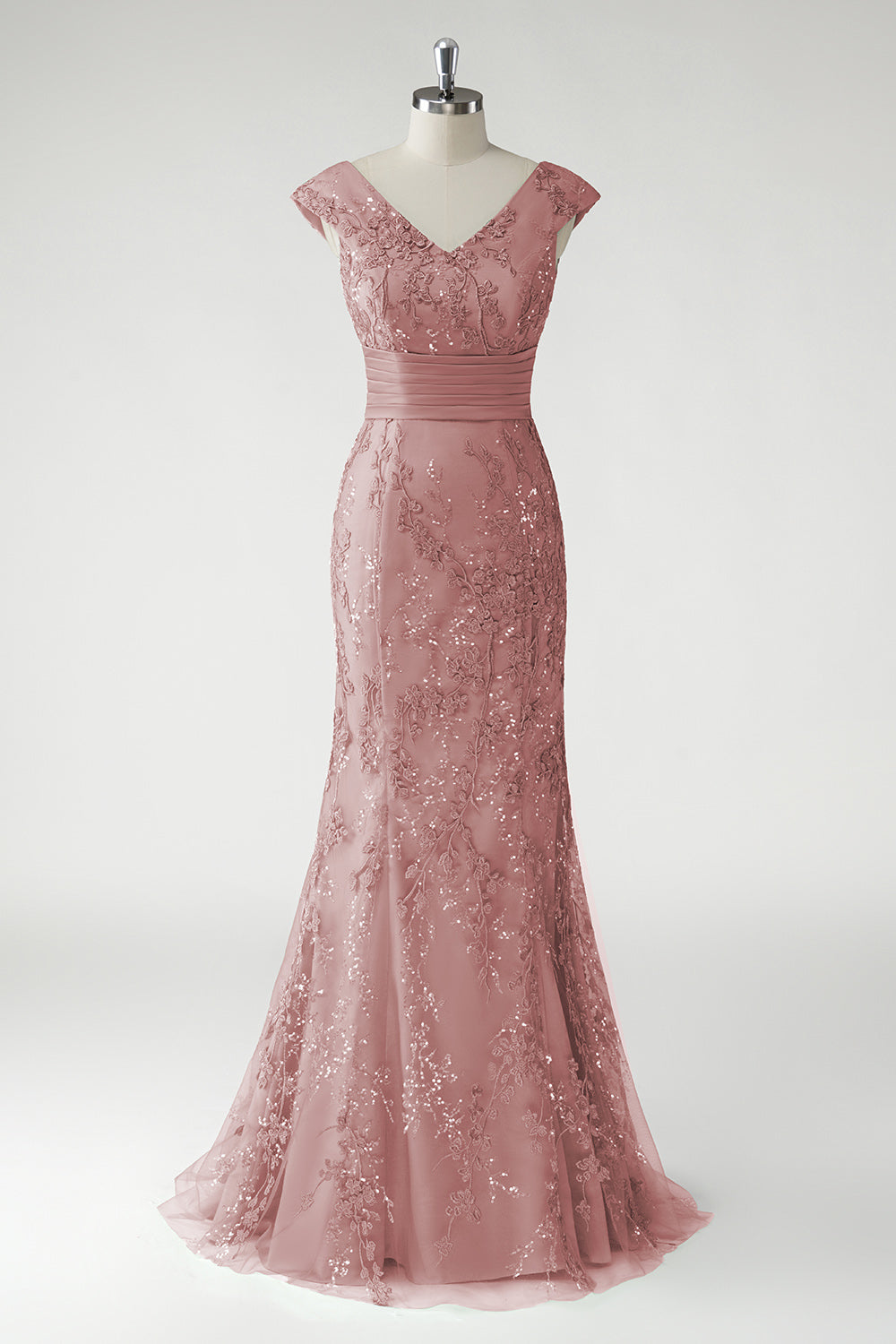 Green V-Neck Mermaid Appliques Sequins Cap Sleeves Prom Dress