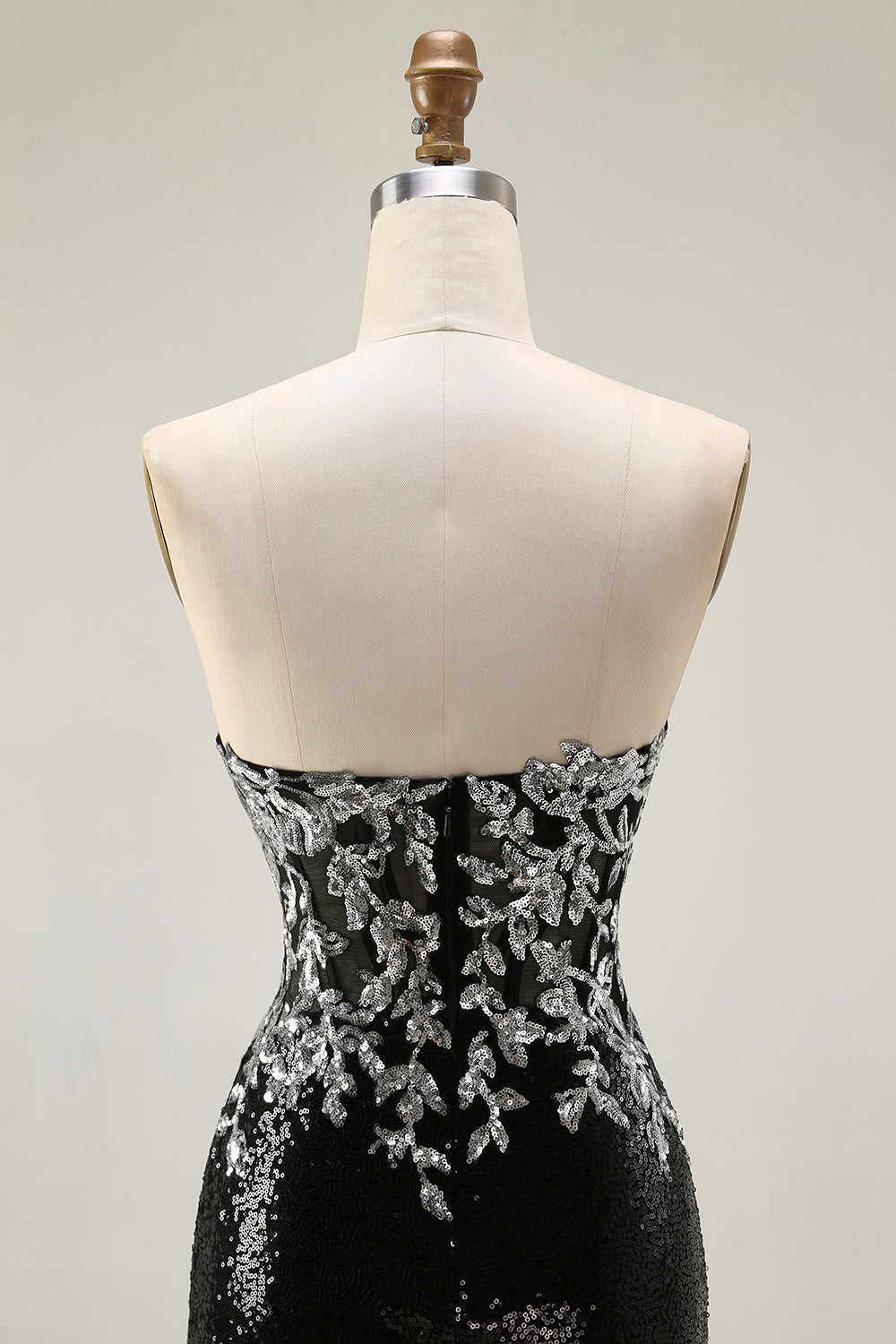 Sparkly Black Silver Mermaid Strapless Sequin Corset Strapless Long Prom Dress