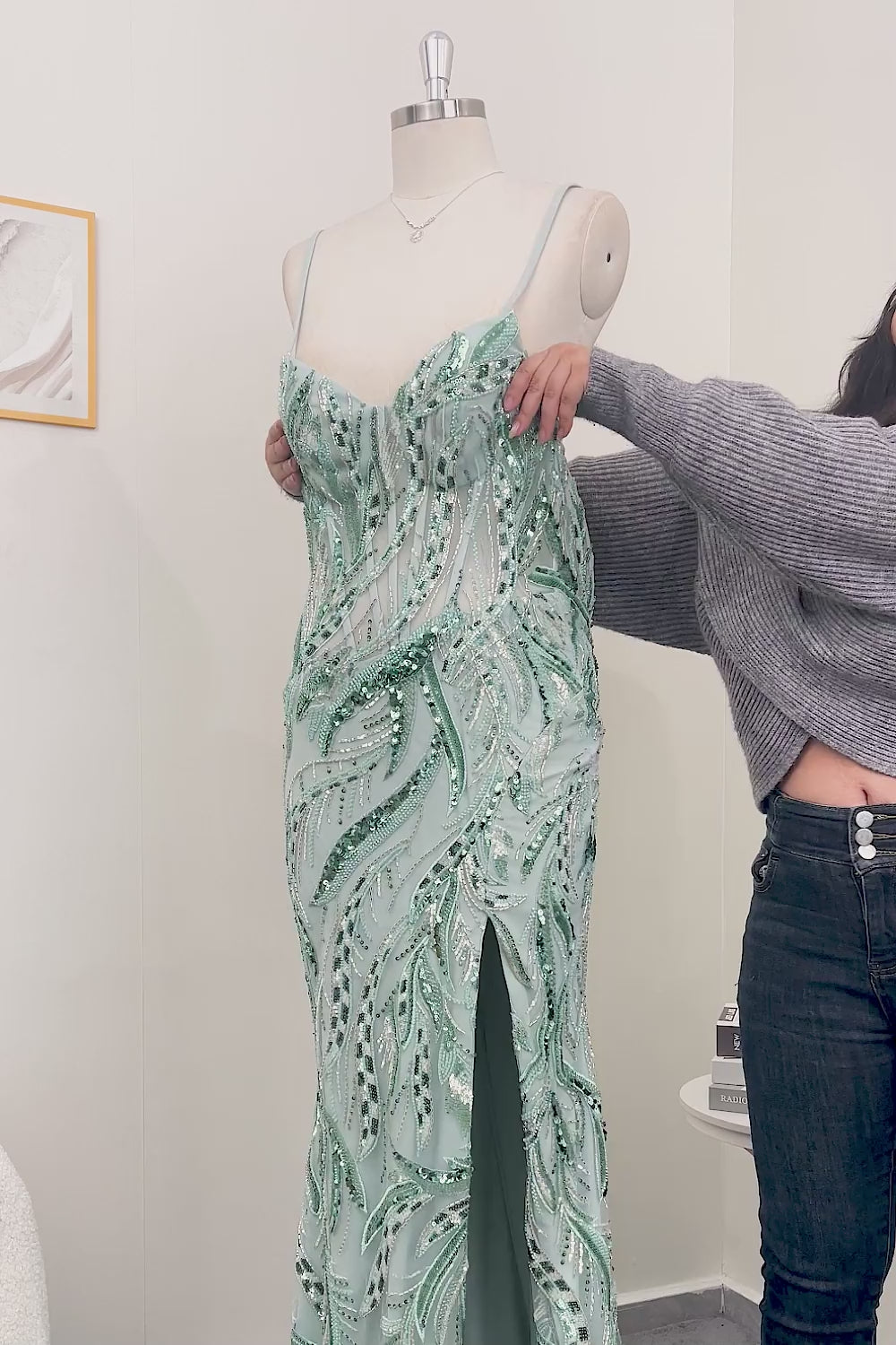 Sparkly Sage Spaghetti Straps Mermaid Long Sequin Prom Dress with Slit