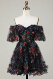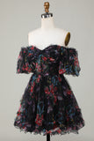 A Line Off the Shoulder Ivory Red Flower Printed Cute Homecoming Dress