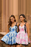 Fuchsia A Line Spaghetti Straps Corset Floral Short Homecoming Dress