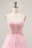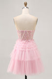 Strapless Pink A Line Corset Homecoming Dress with Appliques