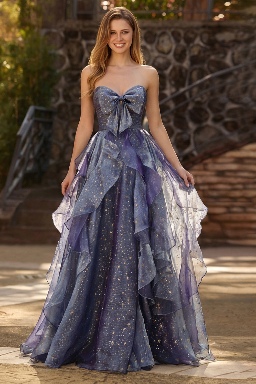 Dusty Blue Strapless A-Line Floral Ruffled Long Prom Dress with Lace Up Back