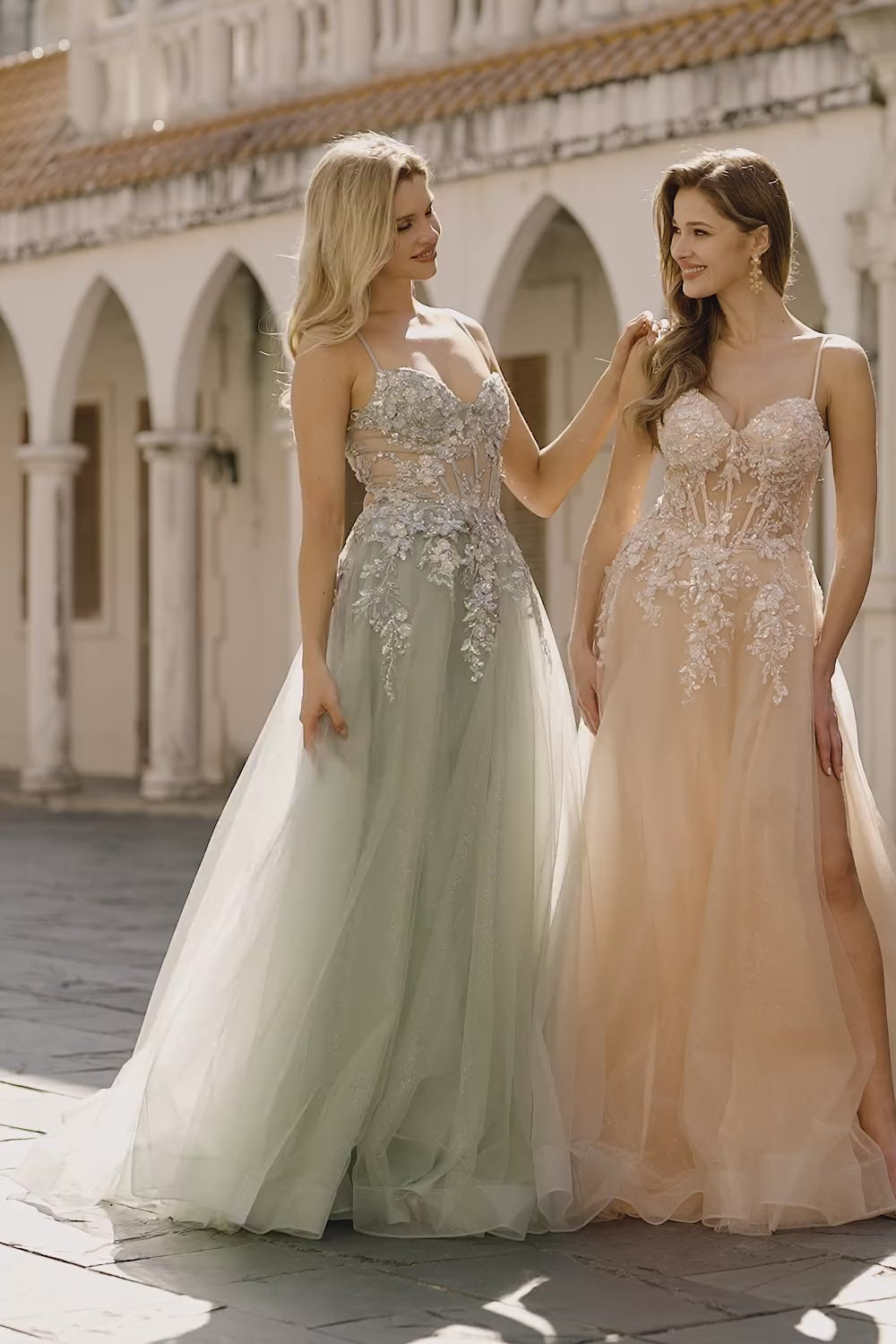 Sage Green A-Line Beaded Long Tulle Prom Dress with Embroidery