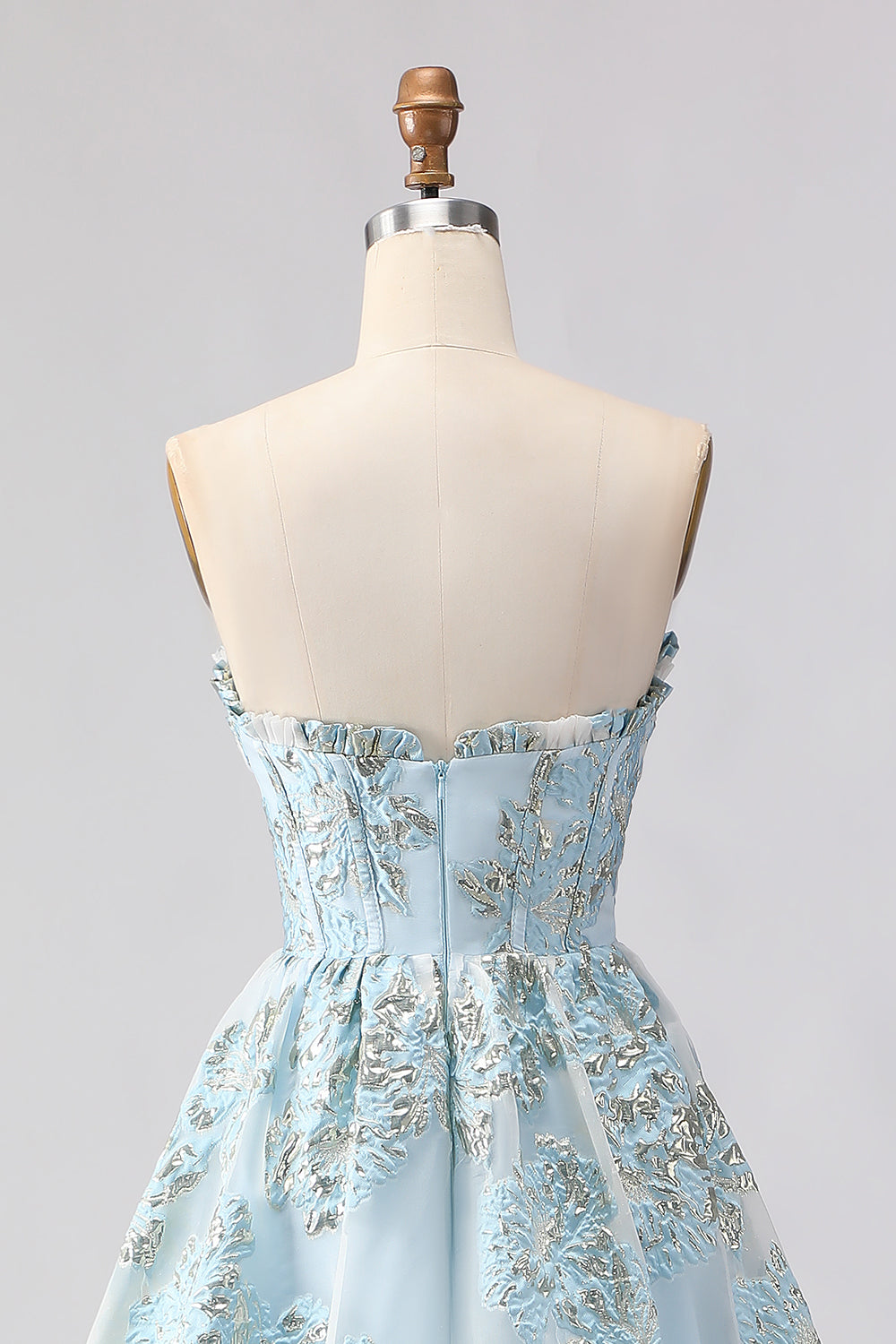 Strapless A Line Pink Jacquard Corset Long Prom Dress with Slit