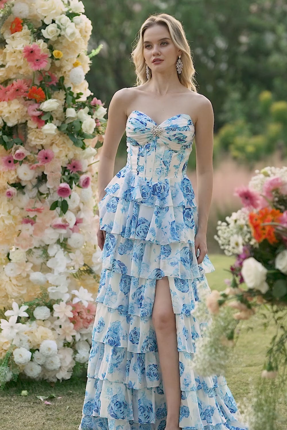 White Blue Floral A Line Strapless Corset Tiered Ruffle Long Prom Dress with Slit