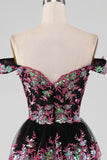 Sparkly Black Pink Tiered Lace A-Line Long Prom Dress with Slit