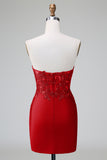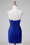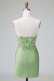 Dark Green Tight Deep V Neck Satin Strapless Short Homecoming Dress with Appliques