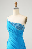 Blue Bodycon One Shoulder Ruched Satin Homecoming Dress with Sequins