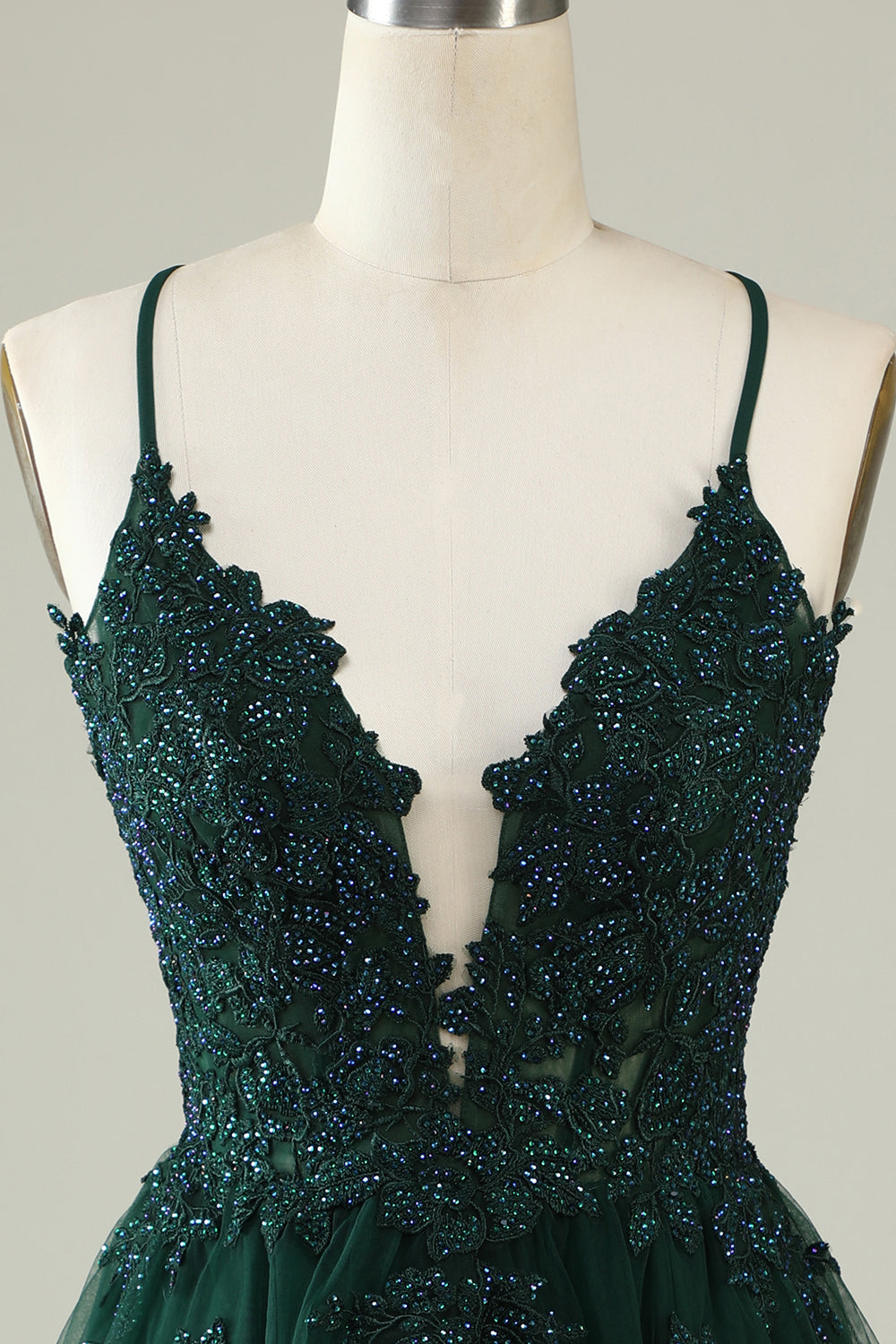 A Line Spaghetti Straps Dark Green Short Homecoming Dress with Appliques