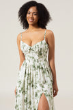 A-Line Spaghetti Straps Green Printed Long Prom Dress With Slit