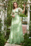 A-Line V-Neck Embroidery Green Long Prom Dress with Short Sleeves