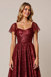 Cabernet A Line Applique Wedding Guest Dress with Short Sleeves