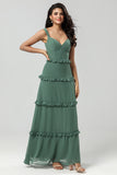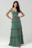 Classic Elegance A Line Off the Shoulder Eucalyptus Long Bridesmaid Dress