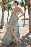 A Line Cold Shoulder Jacquard Dusty Sage Bridesmaid Dress with Slit