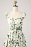 Green Floral Ruffles Tiered Prom Dress with Slit