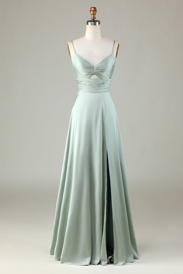 Keyhole Spaghetti Straps Matcha Bridesmaid Dress with Slit