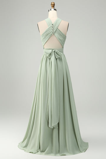 A Line Halter Chiffon Sage Green Pleated Long Bridesmaid Dress with Slit