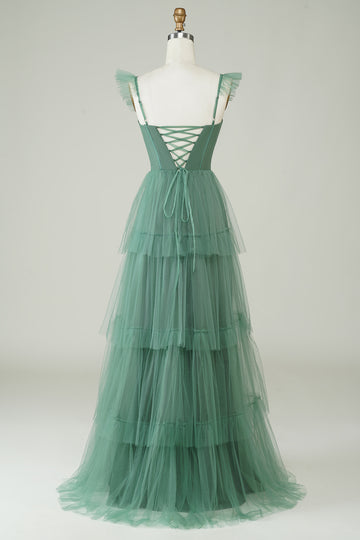 Green A-Line Spaghetti Straps Long Corset Prom Dress with Appliques