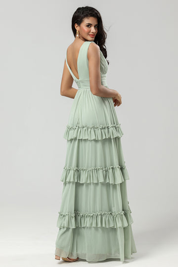 A Line Spaghetti Straps Sage Flower Long Bridesmaid Dress with Ruffles