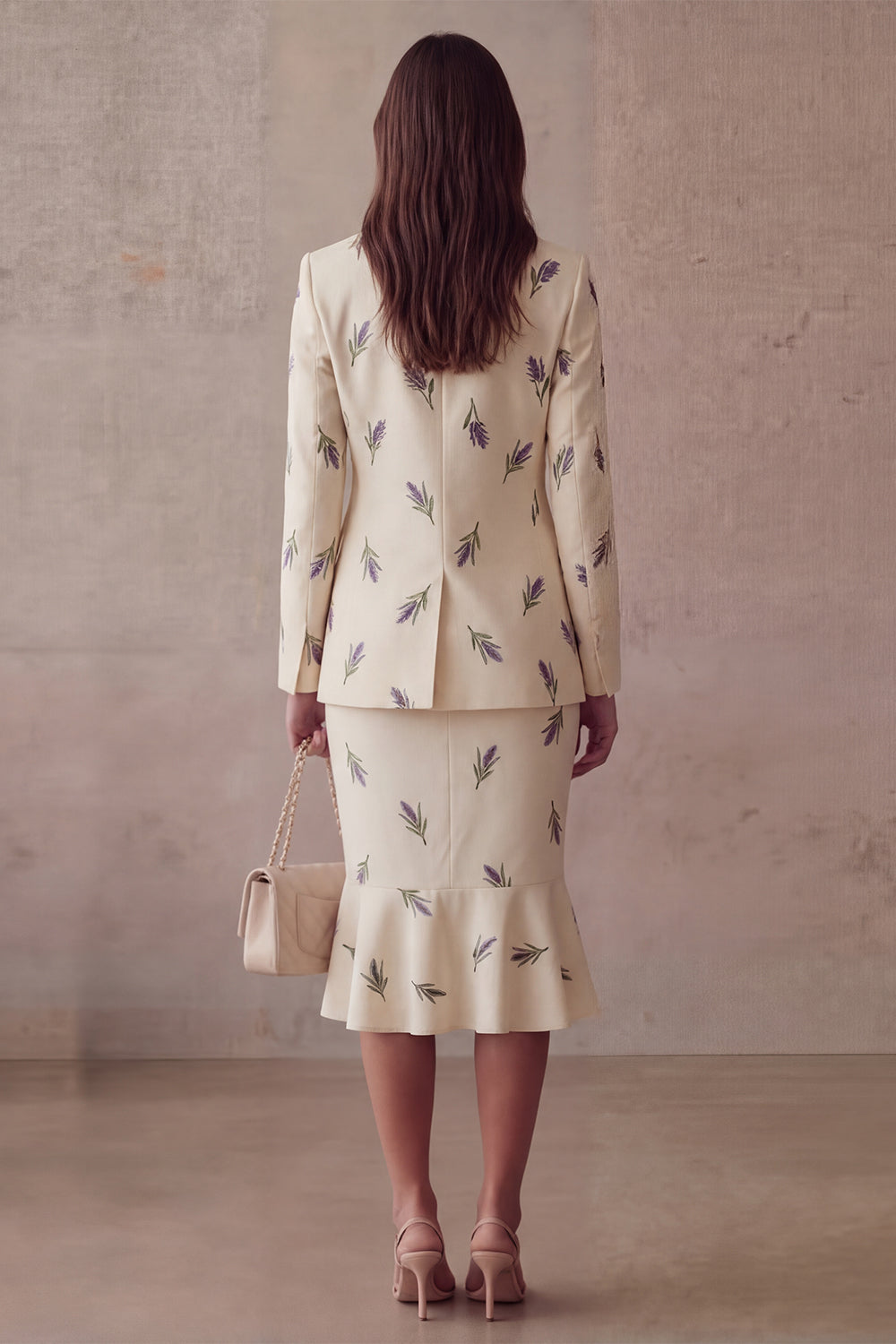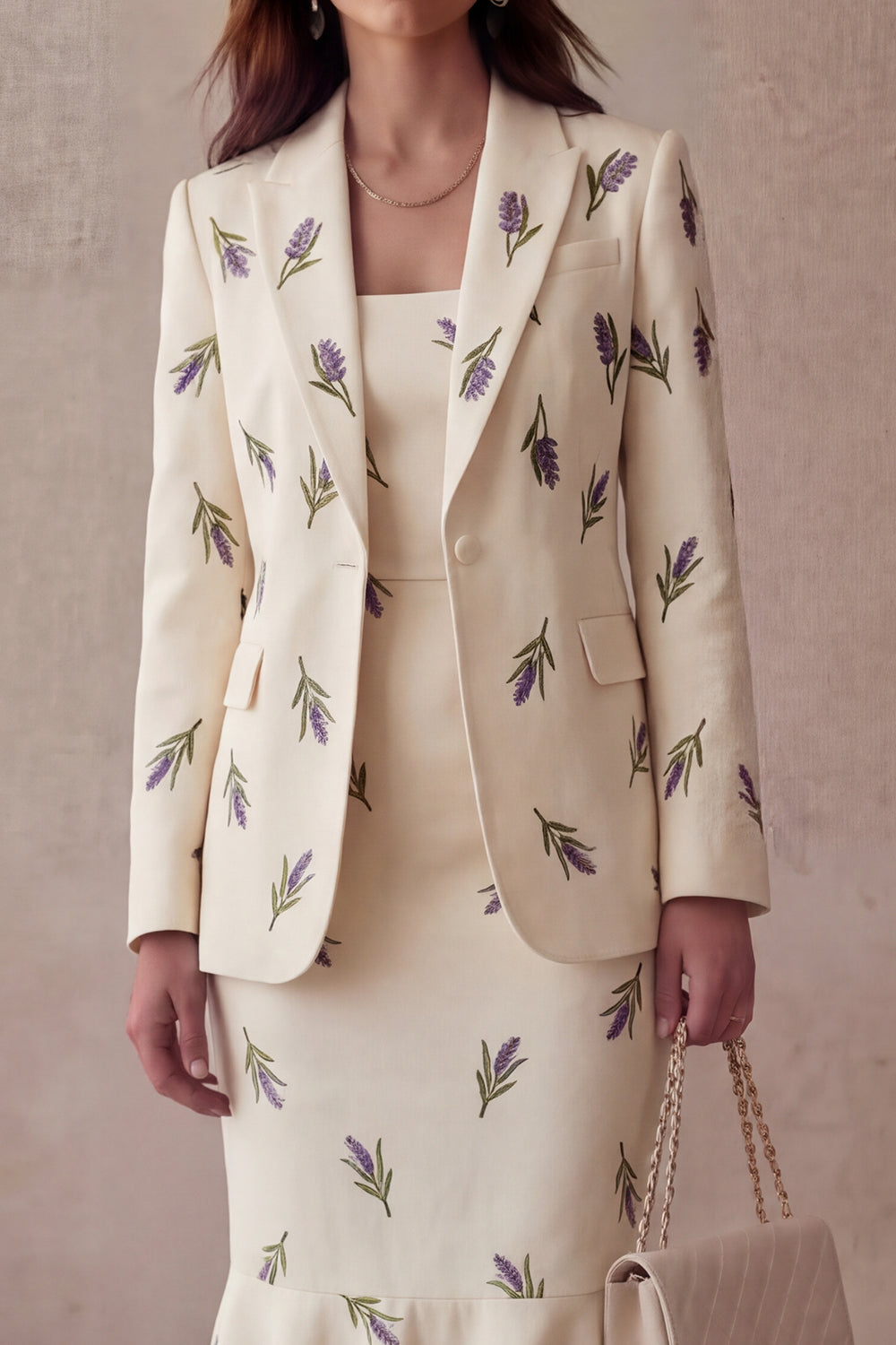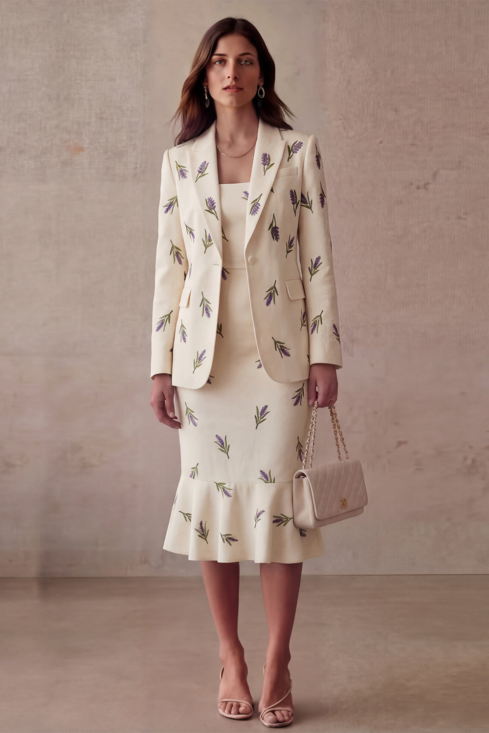 Ivory Purple Flowers 2 Piece One Button Peak Lapel Work Dress with Ruffles