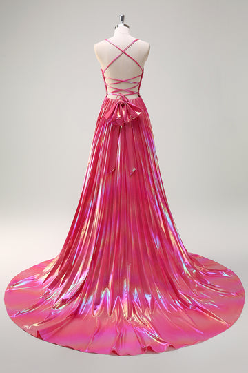Fuchsia A-Line Spaghetti Straps Metallic Pleated Long Prom Dress with Slit