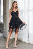 Black Tulle Tiered Spaghetti Straps Short Homecoming Dress with Beading