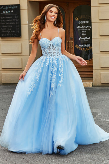 Tulle A-Line Spaghetti Straps Sky Blue Long Corset Prom Dress with Appliques