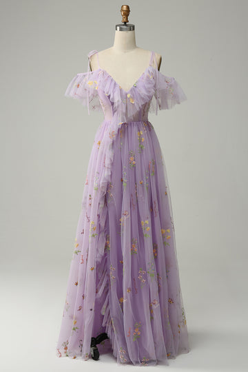 A-Line V-Neck Spaghetti Straps Embroidery Lavender Long Prom Dress with Slit