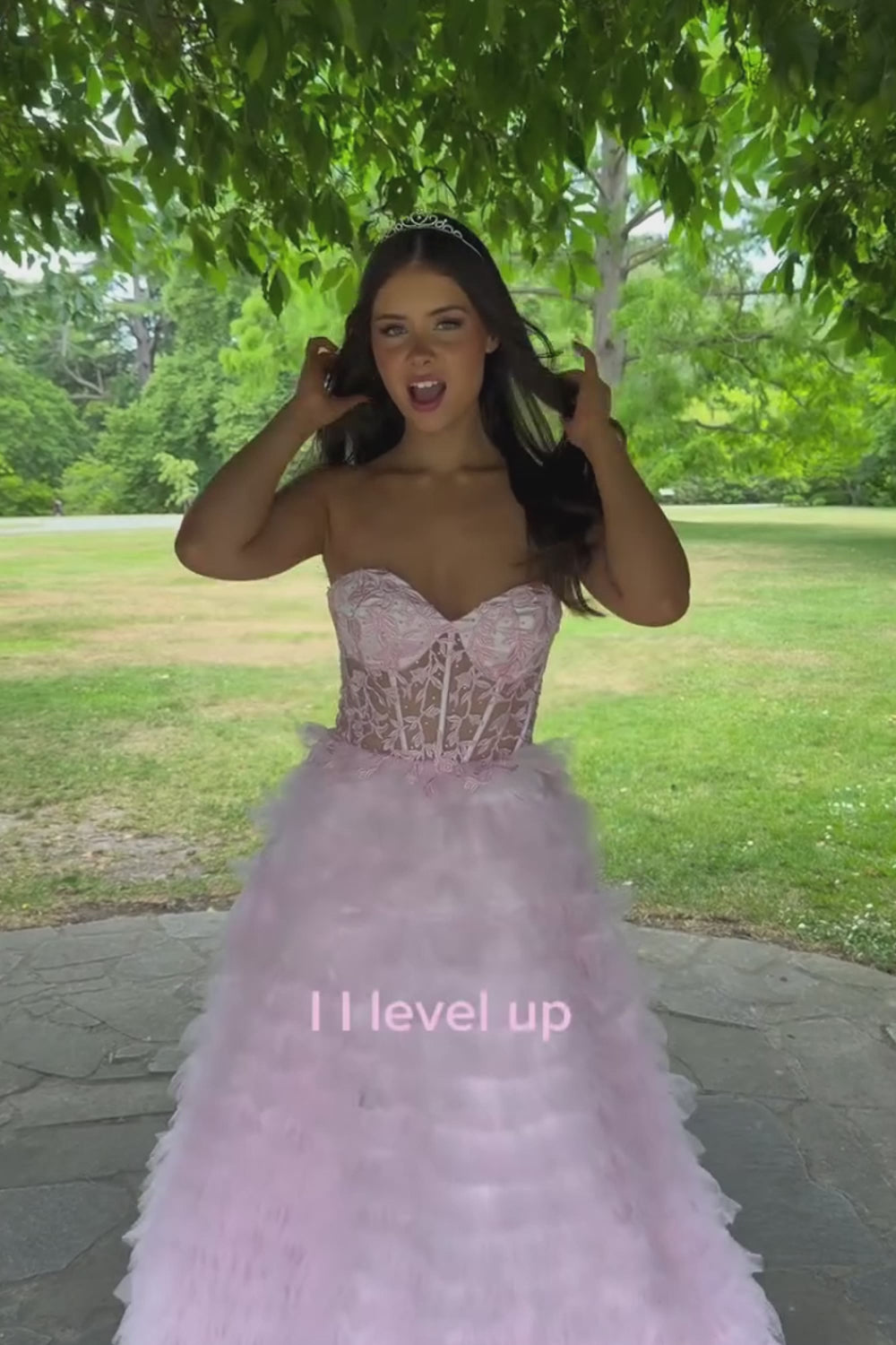 Pink A-Line Strapless Tiered Long Corset Prom Dress