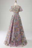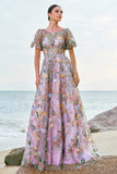 Mauve Ball-Gown/Princess Long Embroidered Prom Dress with Short Sleeves