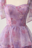 A Line Tiered Purple Printed Tea-Length Long Prom Dress