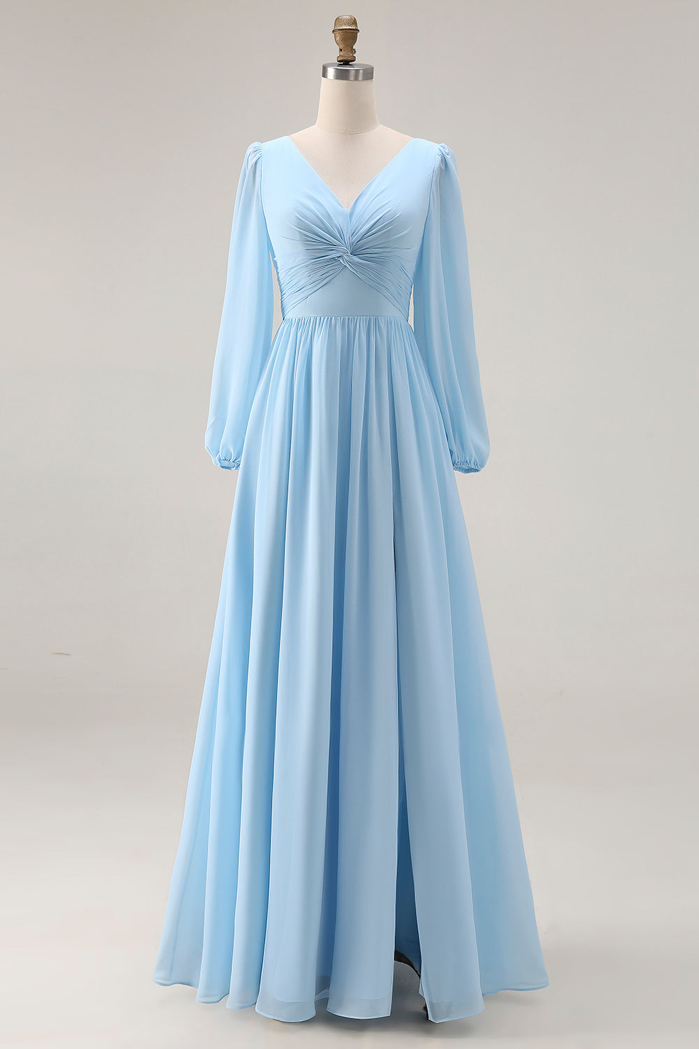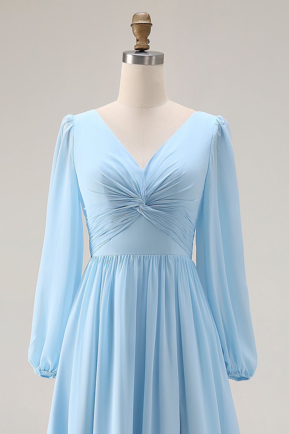 Sky Blue Ruched A-Line V Neck Long Sleeves Wedding Guest Dress with Slit