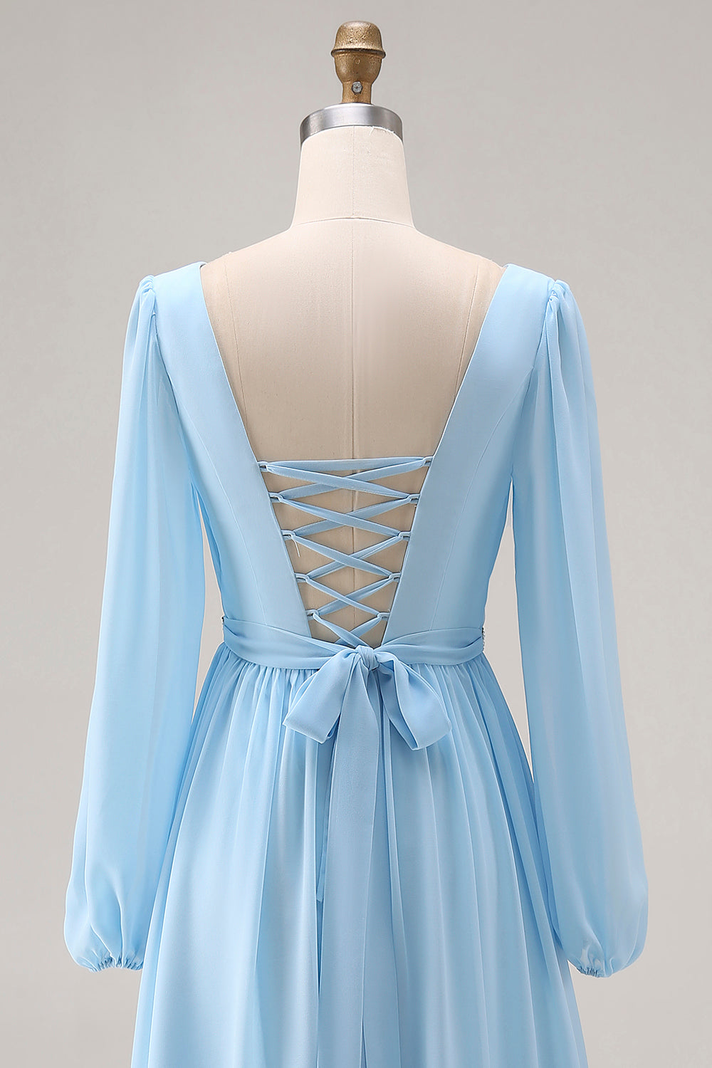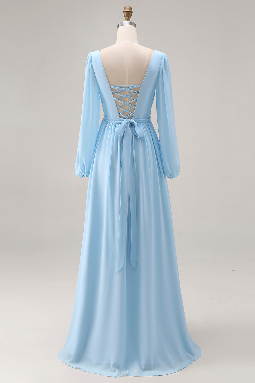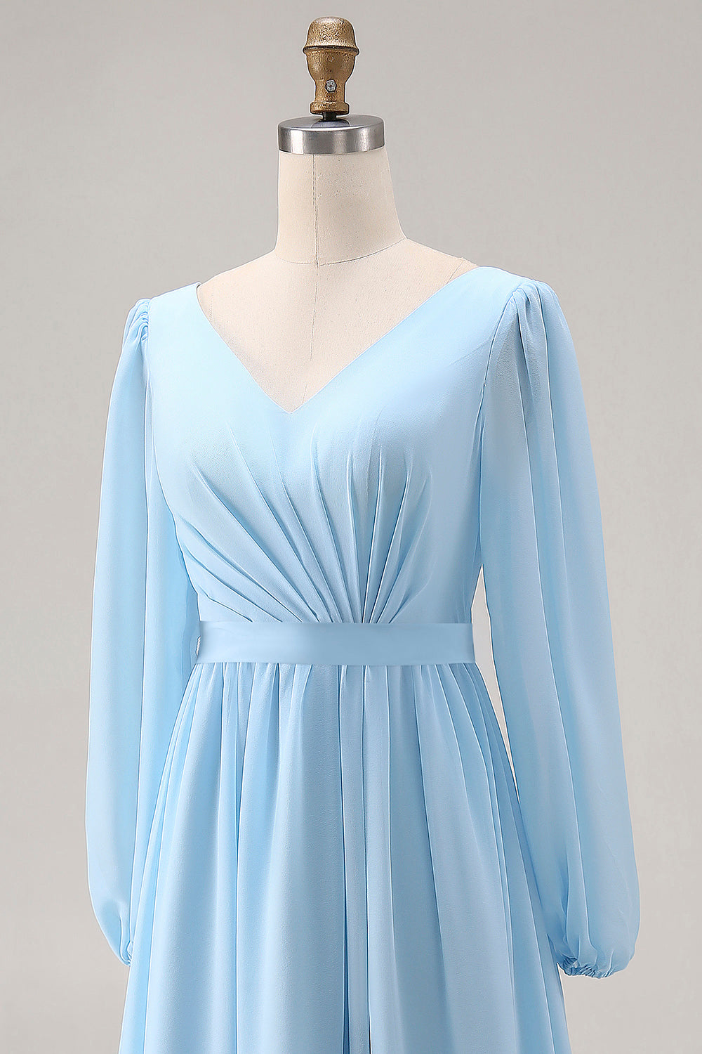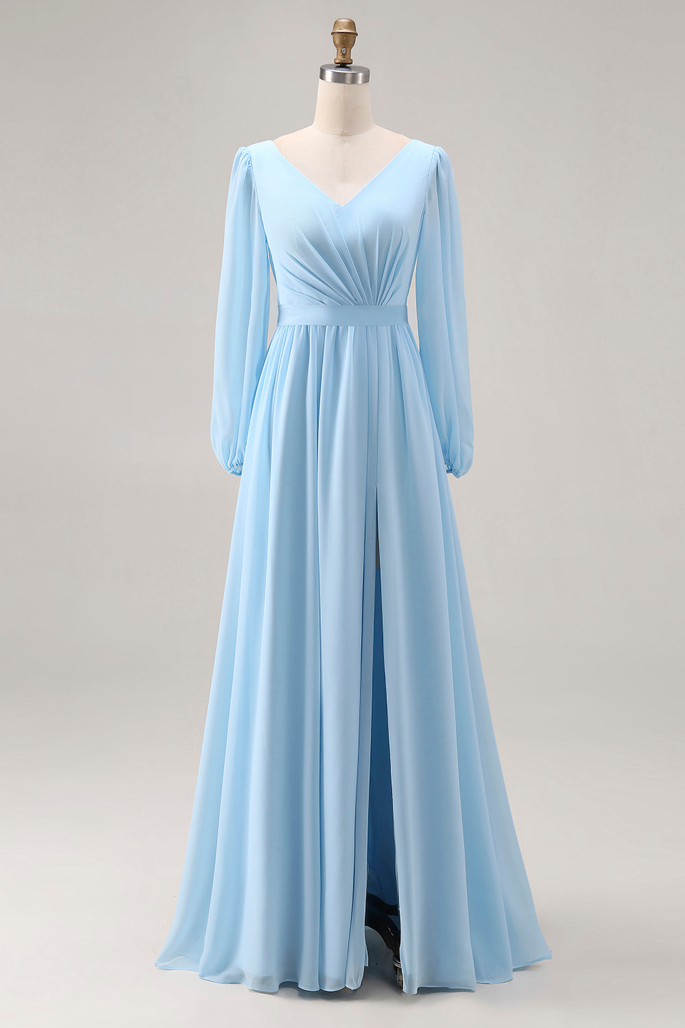 Sky Blue V Neck Long Sleeves Ruched Wedding Guest Dress with Slit