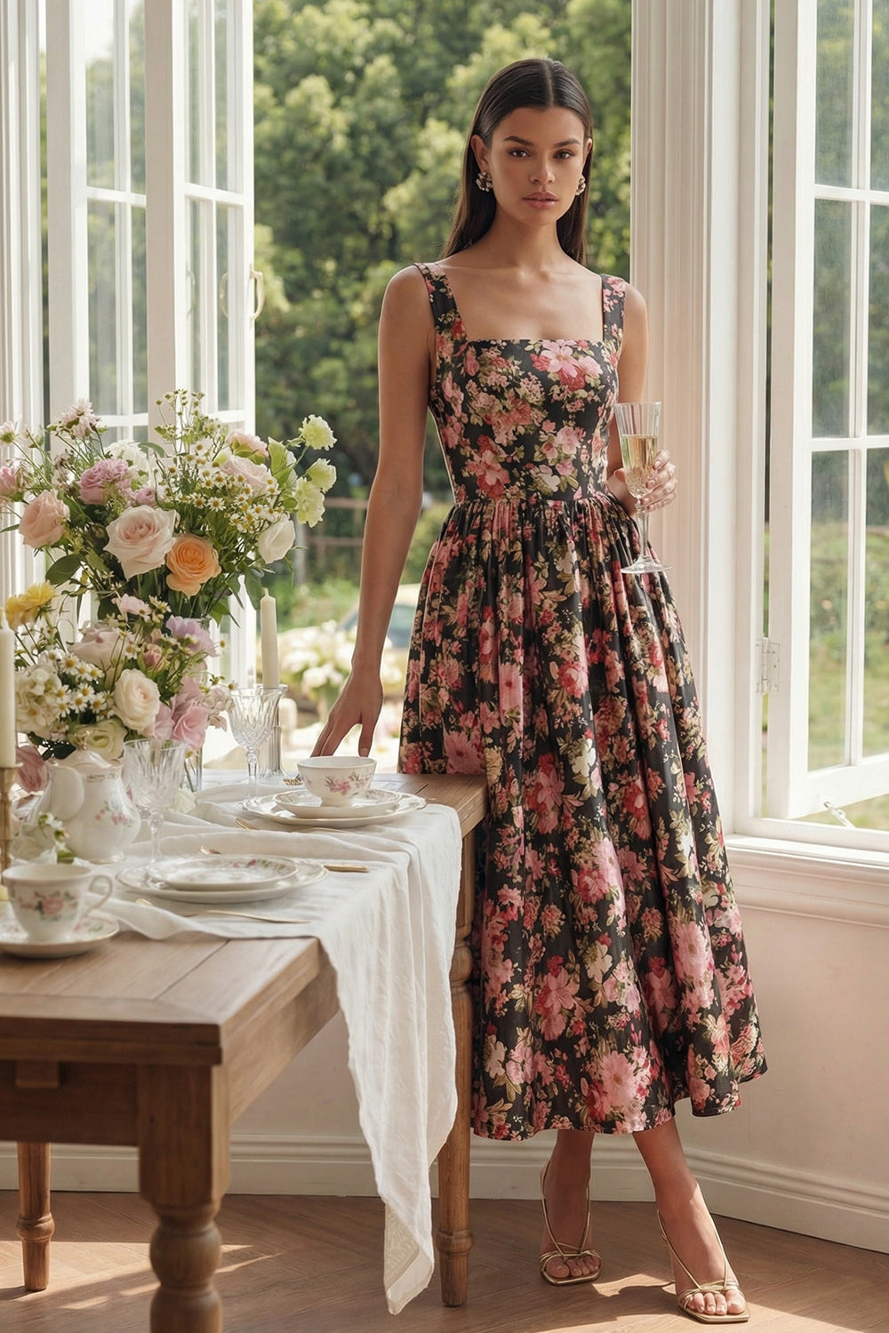 Black Pink Flower Square Neck A-Line Midi Dress