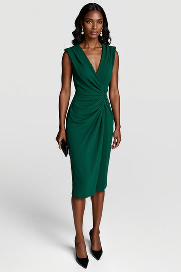 Dark Green Ruched V Neck Bodycon Knee Length Work Dress