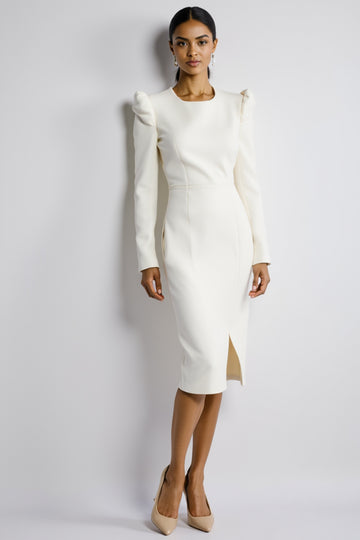 Long Sleeve Bodycon Knee Length White Work Dress With Slit