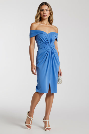 Blue Ruched Off The Shoulder Bodycon Work Dress with Slit