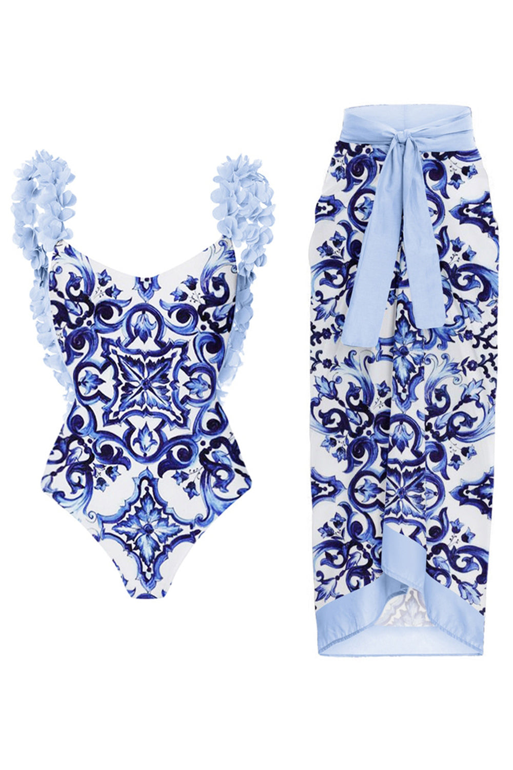 2 Piece Blue Ruffled Print Swimsuit with Cover Up