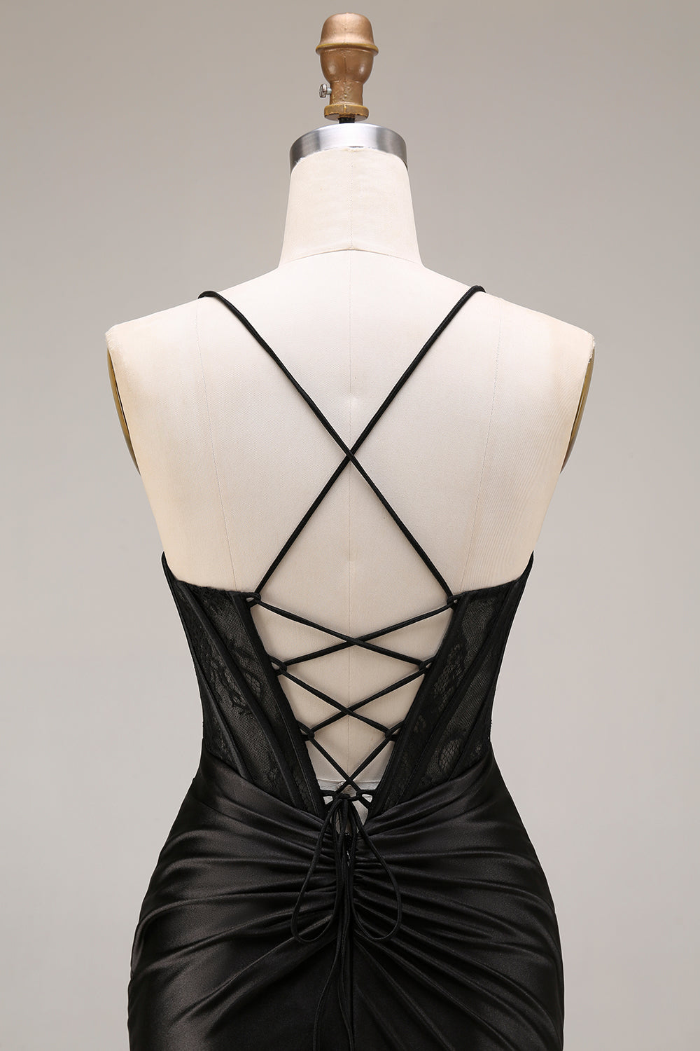 Black Satin Spaghetti Straps Mermaid Long Formal Dress with Slit