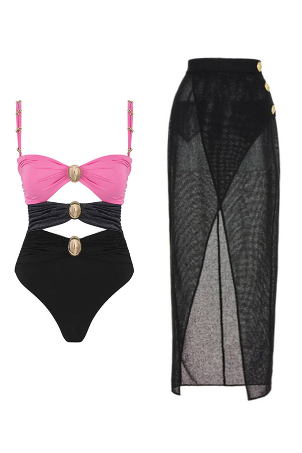 Black Spaghetti Straps 2 Piece Cut Out Swimsuit with Beach Dress