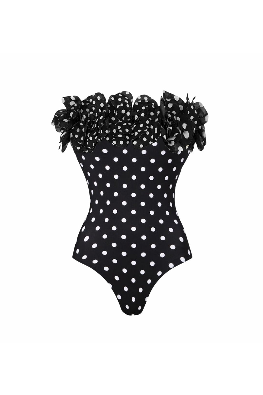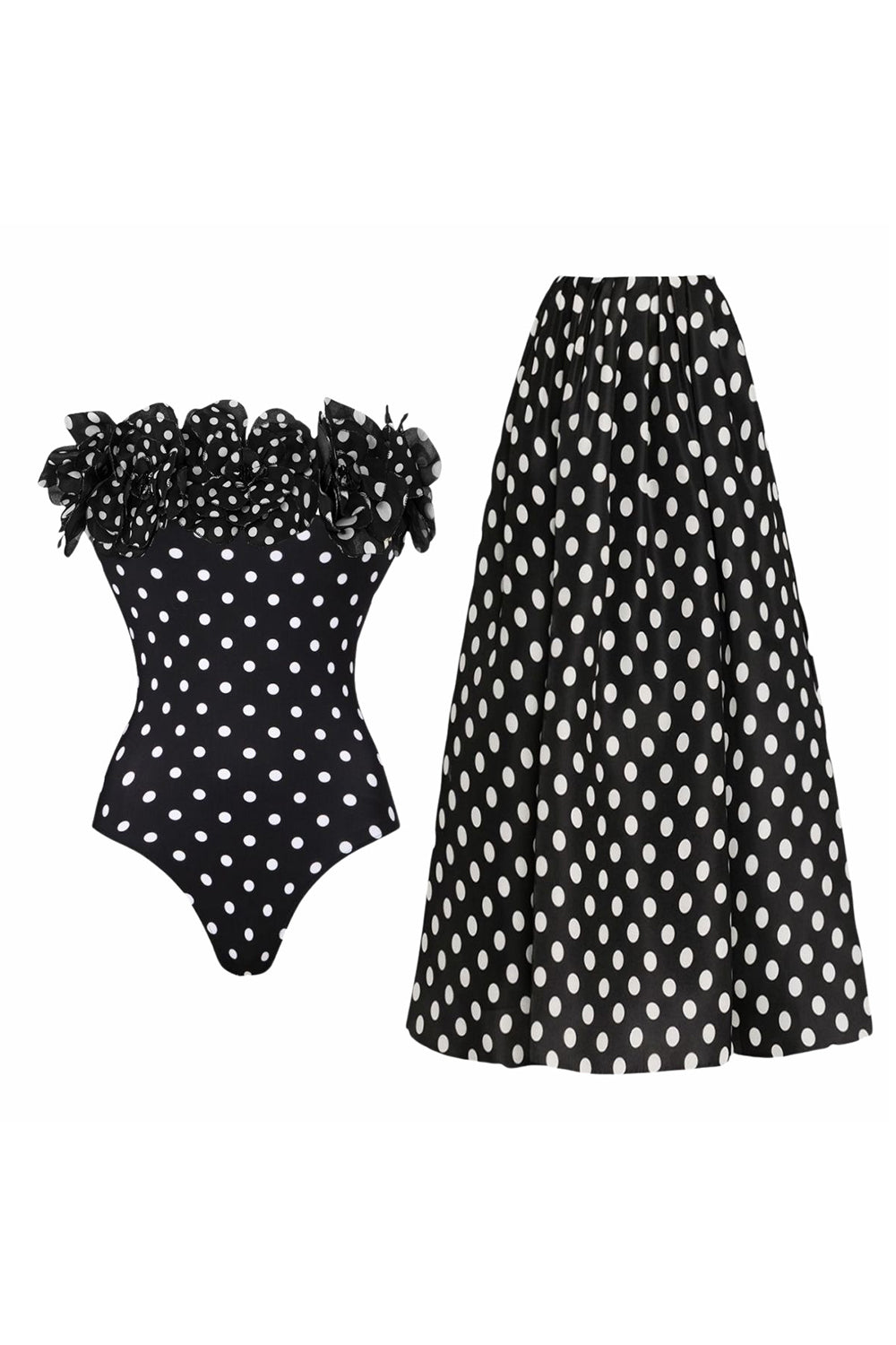 Black White Dots 2 Piece Strapless Ruffled Swimsuit with Cover Up Skirt