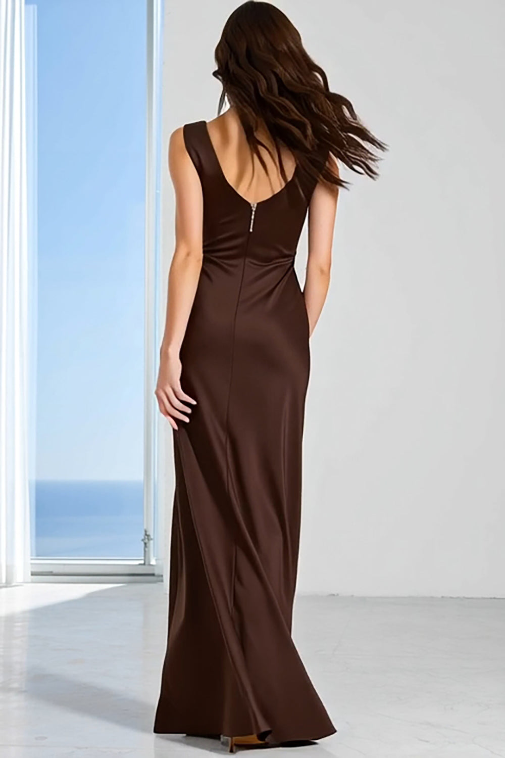 Coffee Bateau Neck Sheath Long Bridesmaid Dress
