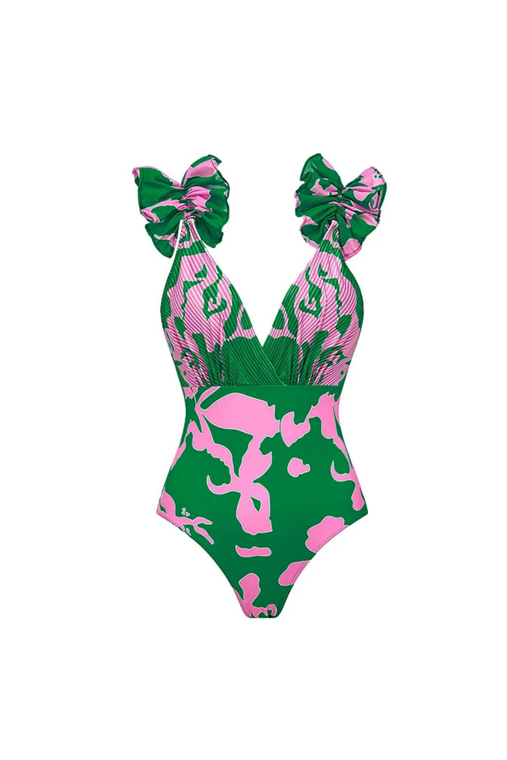 Dark Green 2 Piece Printed Floral V Neck Swimsuit with Cover Up